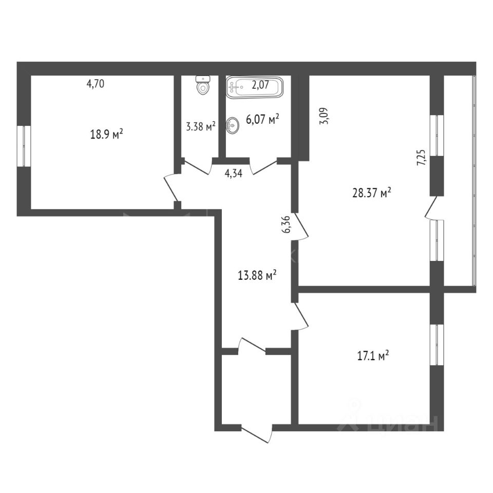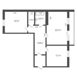 Общая площадь 87,7 м2: кухня 17,1 м2, спальни 18,9 и 28,4 м2, большая лоджия 7,4 м2.