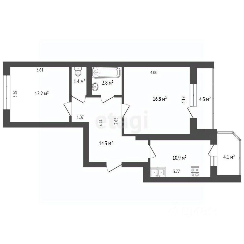 Площадь 59 м²: 2 изолированные комнаты, кухня-гостиная 12 м².
