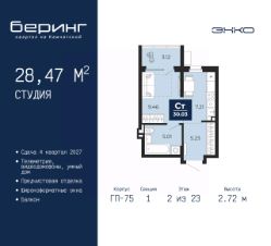 1-комн. квартира-студия с предчистовой отделкой в ЖК "Беринг" на 2 этаже. Общая площадь: 28.47 кв.м., площадь гостиной 16.67 кв.м., из которых 7.21 кв.м. выделено под кухонную зону. Все окна выходят на одну сторону. В квартире один балкон, один совмещенный санузел. Высота потолков 2.72 м.