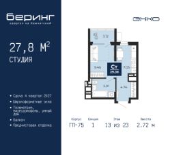 Продается 1-комн. квартира-студия с предчистовой отделкой в ЖК "Беринг" на 13 этаже. Общая площадь: 27.8 кв.м., площадь гостиной 16.49 кв.м., из которых 7.03 кв.м. выделено под кухонную зону. Все окна выходят на одну сторону. В квартире один балкон, один совмещенный санузел. Высота потолков 2.72 м.