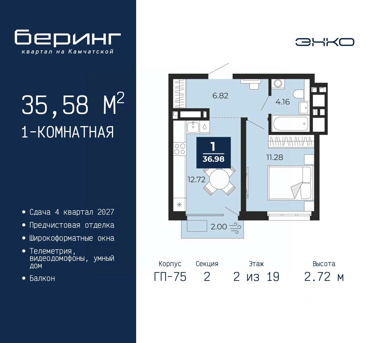 1-комн. квартира с предчистовой отделкой в ЖК "Беринг" на 2 этаже. Общая площадь: 35.58 кв.м., жилая: 11.28 кв.м., площадь просторной кухни-столовой: 12.72 кв.м. Все окна выходят на одну сторону. В квартире один балкон, один совмещенный санузел. Высота потолков 2.72 м.