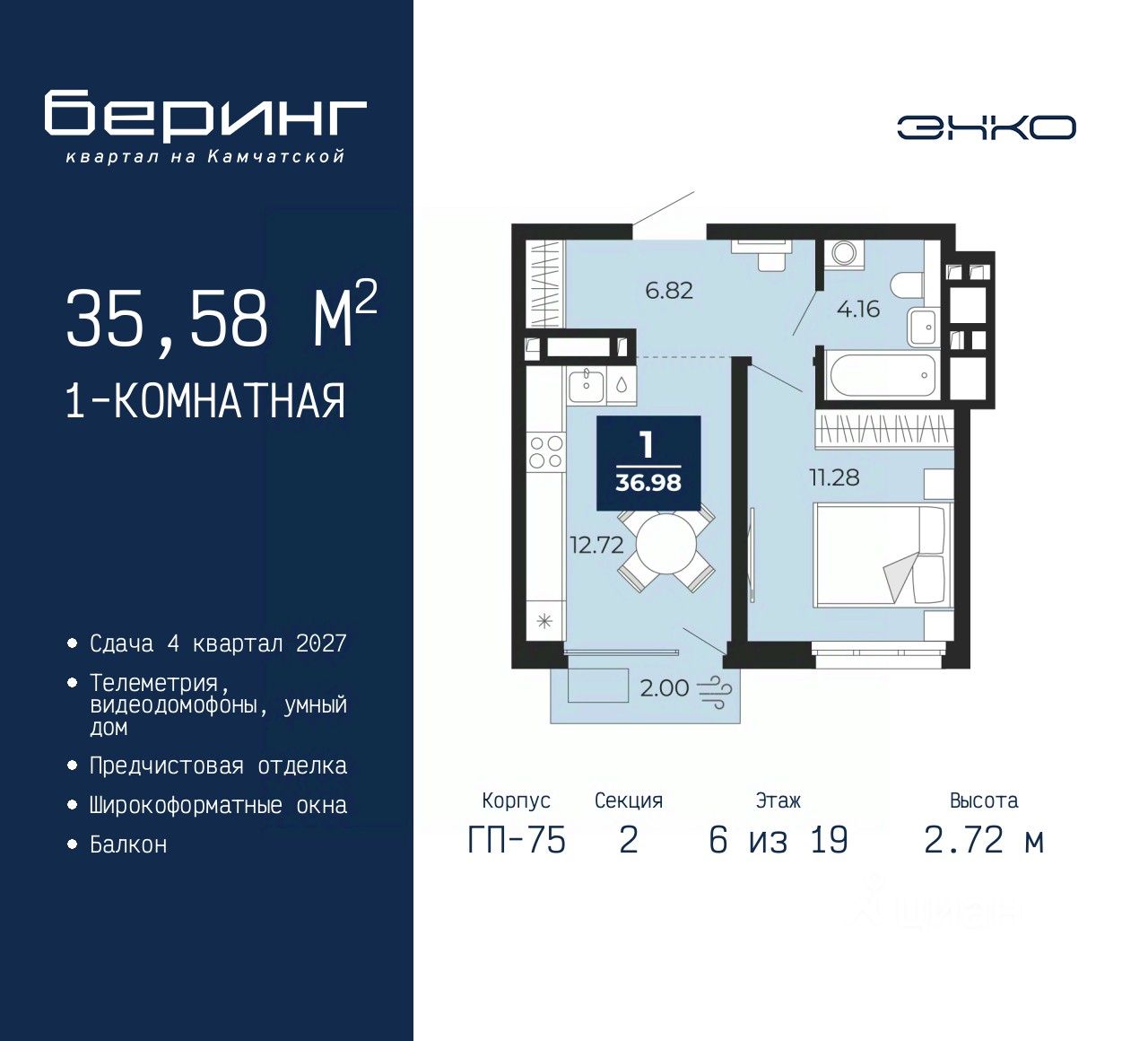Продается однокомнатная квартира с предчистовой отделкой в ЖК "Беринг" на 6 этаже. Общая площадь: 35.58 кв.м., жилая: 11.28 кв.м., площадь просторной кухни-столовой: 12.72 кв.м. Все окна выходят на одну сторону. В квартире один балкон, один совмещенный санузел. Высота потолков 2.72 м.