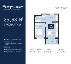 Продается однокомнатная квартира от застройщика с предчистовой отделкой в ЖК "Беринг" на 6 этаже. Общая площадь: 35.68 кв.м., жилая: 10.66 кв.м., площадь просторной кухни-столовой: 12.71 кв.м. Все окна выходят на одну сторону. В квартире один балкон, один совмещенный санузел. Высота потолков 2.72 м.