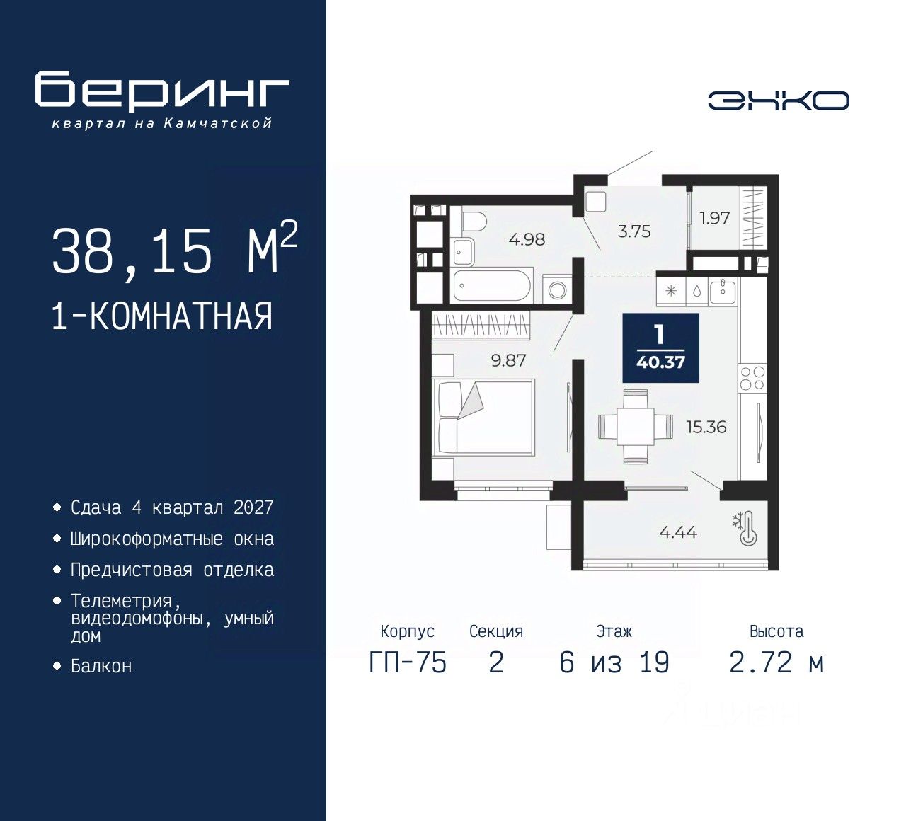 1-комн. квартира с предчистовой отделкой в ЖК "Беринг" на 6 этаже. Общая площадь: 38.15 кв.м., жилая: 9.87 кв.м., площадь просторной кухни-столовой: 15.36 кв.м. Все окна выходят на одну сторону. В квартире один балкон, один совмещенный санузел. Высота потолков 2.72 м.