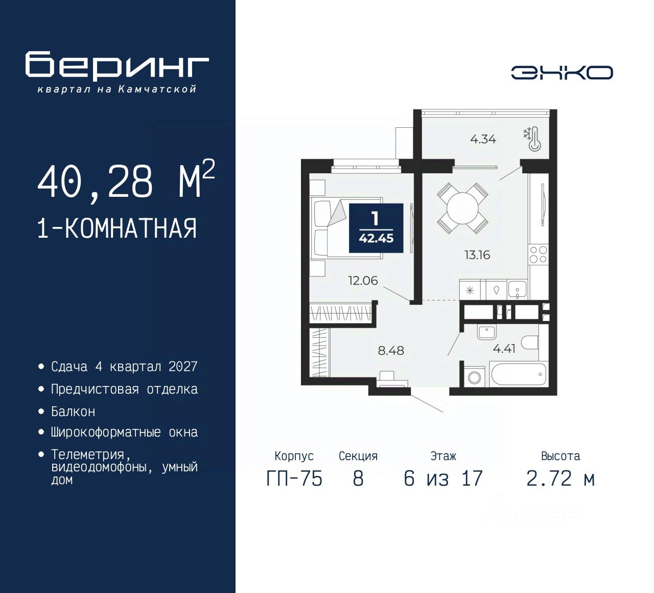 Однокомнатная квартира с предчистовой отделкой в ЖК "Беринг" на 6 этаже. Общая площадь: 40.28 кв.м., жилая: 12.06 кв.м., площадь просторной кухни-столовой: 13.16 кв.м. Все окна выходят на одну сторону. В квартире один балкон, один совмещенный санузел. Высота потолков 2.72 м.