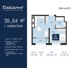 1-комн. квартира с предчистовой отделкой в ЖК "Беринг" на 13 этаже. Общая площадь: 39.64 кв.м., жилая: 11.46 кв.м., площадь просторной кухни-столовой: 13.71 кв.м. Все окна выходят на одну сторону. В квартире одна лоджия, один совмещенный санузел. Высота потолков 2.72 м.