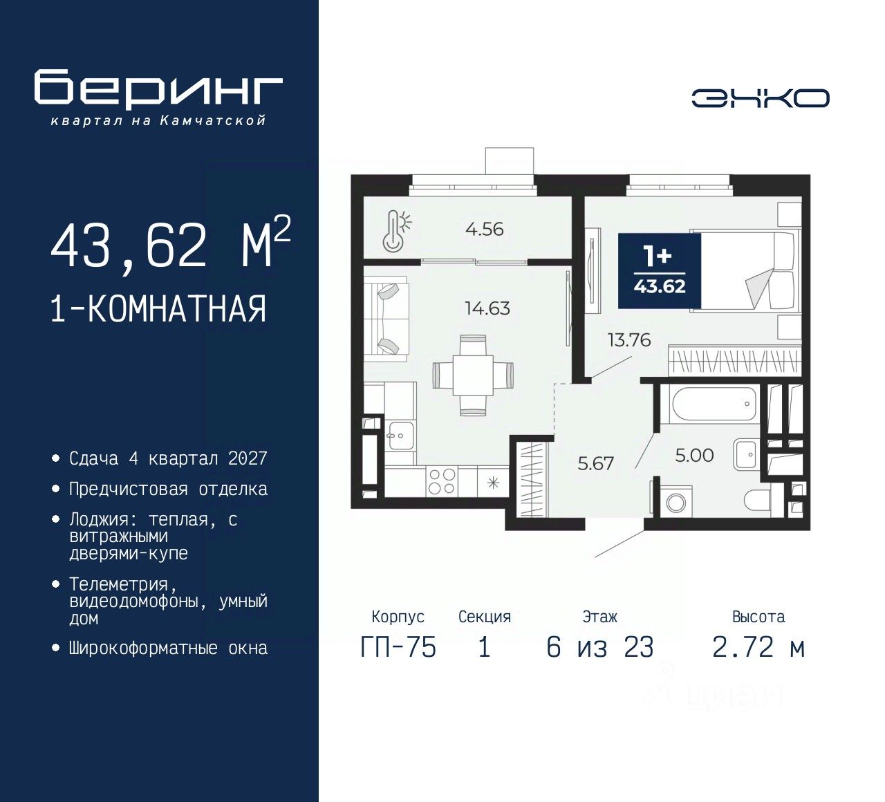 1-комн. квартира с предчистовой отделкой в ЖК "Беринг" на 6 этаже. Общая площадь: 43.62 кв.м., жилая: 13.76 кв.м., площадь просторной кухни-столовой: 14.63 кв.м. Все окна выходят на одну сторону. В квартире одна лоджия, один совмещенный санузел. Высота потолков 2.72 м.