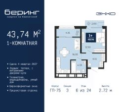 1-комн. квартира от застройщика с предчистовой отделкой в ЖК "Беринг" на 6 этаже. Общая площадь: 43.74 кв.м., жилая: 12.5 кв.м., площадь просторной кухни-столовой: 16.03 кв.м. Все окна выходят на одну сторону. В квартире один балкон и одна лоджия, один совмещенный санузел. Высота потолков 2.72 м.