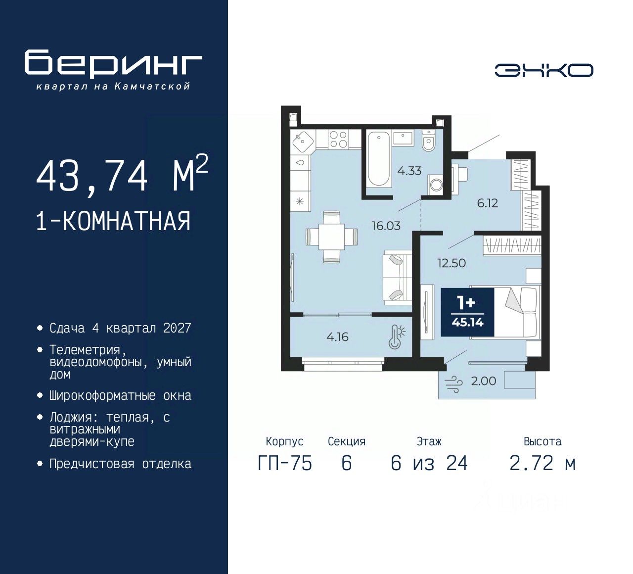 Однокомнатная квартира с предчистовой отделкой в ЖК "Беринг" на 6 этаже. Общая площадь: 43.74 кв.м., жилая: 12.5 кв.м., площадь просторной кухни-столовой: 16.03 кв.м. Все окна выходят на одну сторону. В квартире один балкон и одна лоджия, один совмещенный санузел. Высота потолков 2.72 м.