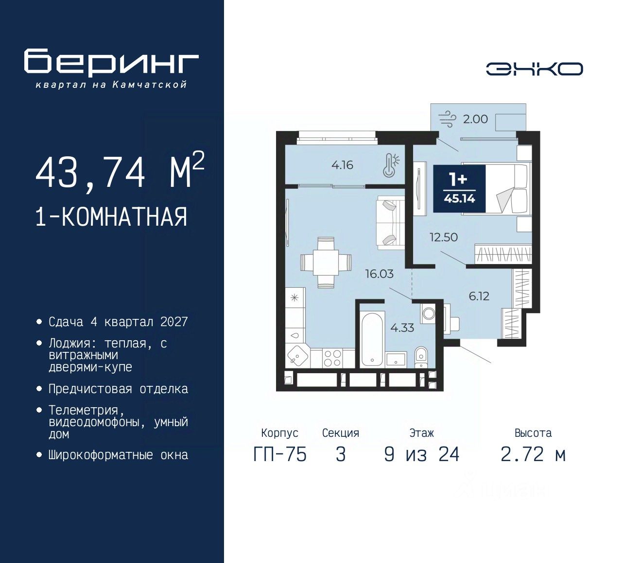 Продается 1-комн. квартира от застройщика с предчистовой отделкой в ЖК "Беринг" на 9 этаже. Общая площадь: 43.74 кв.м., жилая: 12.5 кв.м., площадь просторной кухни-столовой: 16.03 кв.м. Все окна выходят на одну сторону. В квартире один балкон и одна лоджия, один совмещенный санузел. Высота потолков 2.72 м.