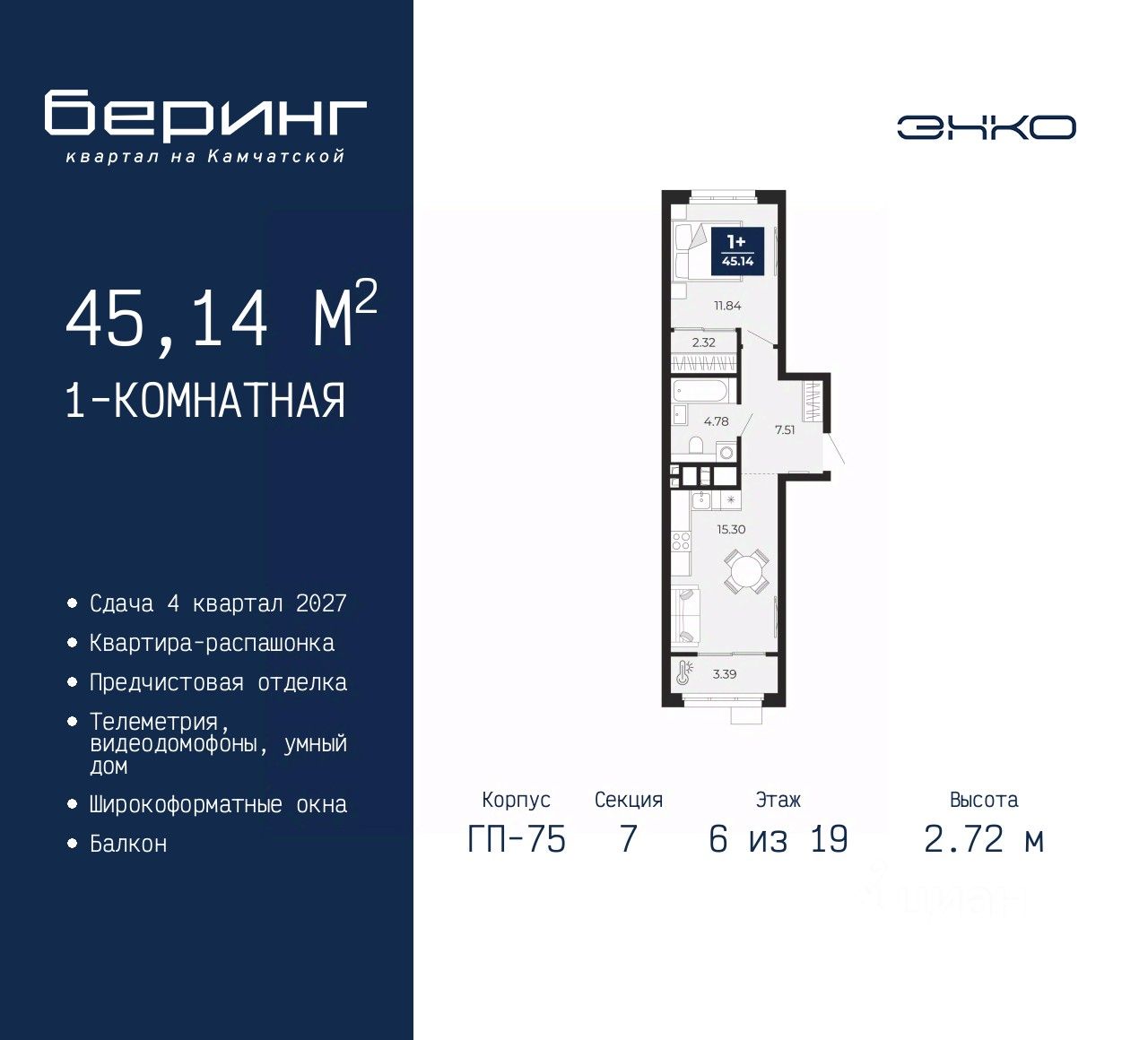 Просторная однокомнатная квартира с предчистовой отделкой в ЖК "Беринг" на 6 этаже. Общая площадь: 45.14 кв.м., жилая: 11.84 кв.м., площадь просторной кухни-столовой: 15.3 кв.м. Квартира - распашонка, без проходных комнат, окна выходят на paзные стороны дома. В квартире один балкон, один совмещенный санузел. Высота потолков 2.72 м.