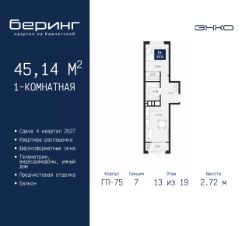 Просторная 1-комн. квартира с предчистовой отделкой в ЖК "Беринг" на 13 этаже. Общая площадь: 45.14 кв.м., жилая: 11.84 кв.м., площадь просторной кухни-столовой: 15.3 кв.м. Квартира - распашонка, без проходных комнат, окна выходят на paзные стороны дома. В квартире один балкон, один совмещенный санузел. Высота потолков 2.72 м.