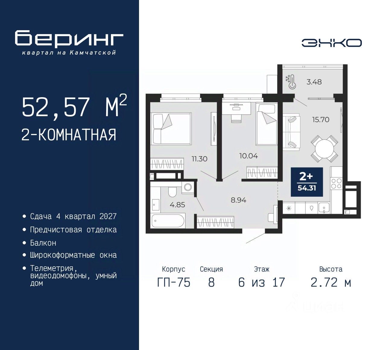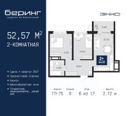Продается 2-комн. квартира от застройщика с предчистовой отделкой в ЖК "Беринг" на 6 этаже. Общая площадь: 52.57 кв.м., жилая: 21.34 кв.м., площадь просторной кухни-столовой: 15.7 кв.м. Комнаты изолированные, все окна выходят на одну сторону. В квартире один балкон, один совмещенный санузел. Высота потолков 2.72 м.
