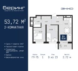 Просторная двухкомнатная квартира с предчистовой отделкой в ЖК "Беринг" на 9 этаже. Общая площадь: 53.72 кв.м., жилая: 20.97 кв.м., площадь просторной кухни-столовой: 15.95 кв.м. Комнаты изолированные, все окна выходят на одну сторону. В квартире один балкон, один совмещенный санузел. Высота потолков 2.72 м.