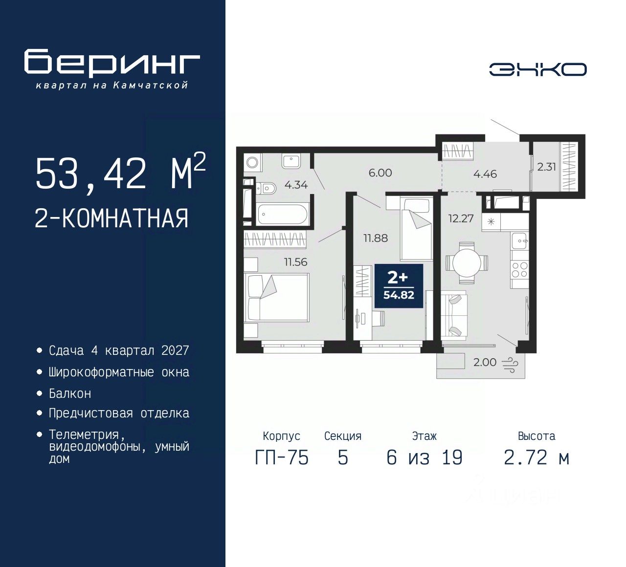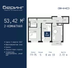 Продается двухкомнатная квартира с предчистовой отделкой в ЖК "Беринг" на 6 этаже. Общая площадь: 53.42 кв.м., жилая: 23.44 кв.м., площадь просторной кухни-столовой: 12.27 кв.м. Комнаты изолированные, все окна выходят на одну сторону. В квартире один балкон, один совмещенный санузел. Высота потолков 2.72 м.