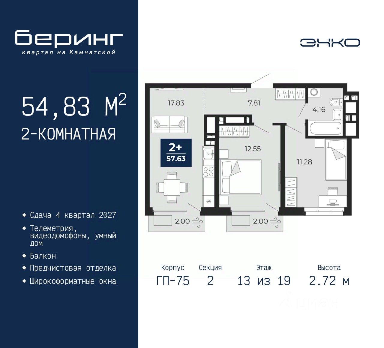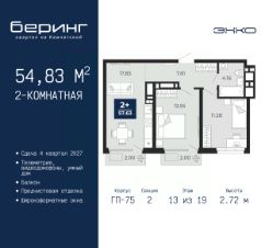 Просторная двухкомнатная квартира с предчистовой отделкой в ЖК "Беринг" на 13 этаже. Общая площадь: 54.83 кв.м., жилая: 23.83 кв.м., площадь просторной кухни-столовой: 17.83 кв.м. Комнаты изолированные, все окна выходят на одну сторону. В квартире два балкона, один совмещенный санузел. Высота потолков 2.72 м.