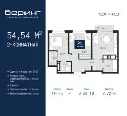 Продается 2-комн. квартира с предчистовой отделкой в ЖК "Беринг" на 6 этаже. Общая площадь: 54.54 кв.м., жилая: 22.21 кв.м., площадь просторной кухни-столовой: 13.43 кв.м. Комнаты изолированные, все окна выходят на одну сторону. В квартире один балкон, два совмещенных санузла. Высота потолков 2.72 м.