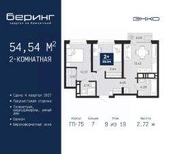 Продается 2-комн. квартира с предчистовой отделкой в ЖК "Беринг" на 9 этаже. Общая площадь: 54.54 кв.м., жилая: 22.21 кв.м., площадь просторной кухни-столовой: 13.43 кв.м. Комнаты изолированные, все окна выходят на одну сторону. В квартире один балкон, два совмещенных санузла. Высота потолков 2.72 м.