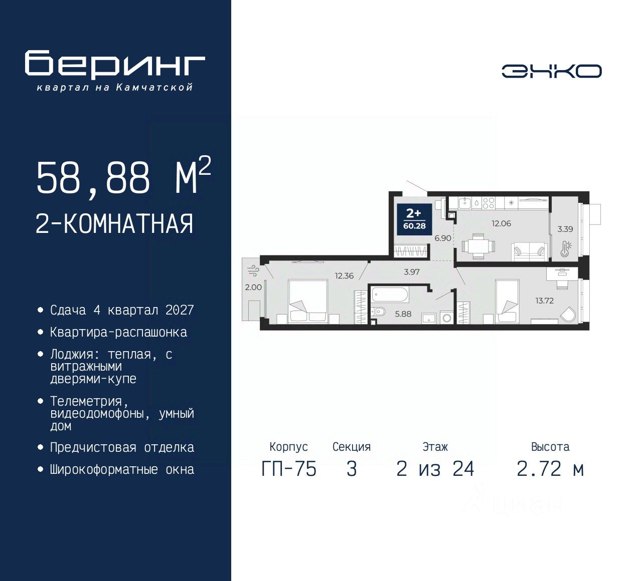 2-комн. квартира от застройщика с предчистовой отделкой в ЖК "Беринг" на 2 этаже. Общая площадь: 58.88 кв.м., жилая: 26.08 кв.м., площадь просторной кухни-столовой: 12.06 кв.м. Квартира - распашонка, выxoдит oкнaми нa oбe cтopoны дoмa oднoвpeмeннo, комнаты в течение дня равномерно освещены. В квартире один балкон и одна лоджия, один совмещенный санузел. Высота потолков 2.72 м.