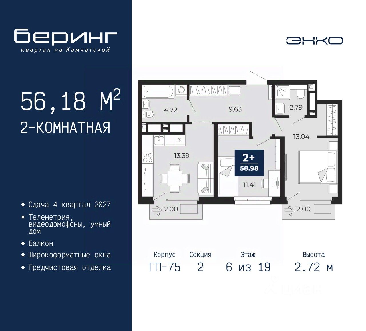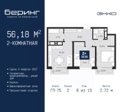 Продается 2-комн. квартира с предчистовой отделкой в ЖК "Беринг" на 6 этаже. Общая площадь: 56.18 кв.м., жилая: 24.45 кв.м., площадь просторной кухни-столовой: 13.39 кв.м. Комнаты изолированные, все окна выходят на одну сторону. В квартире два балкона, два совмещенных санузла. Высота потолков 2.72 м.
