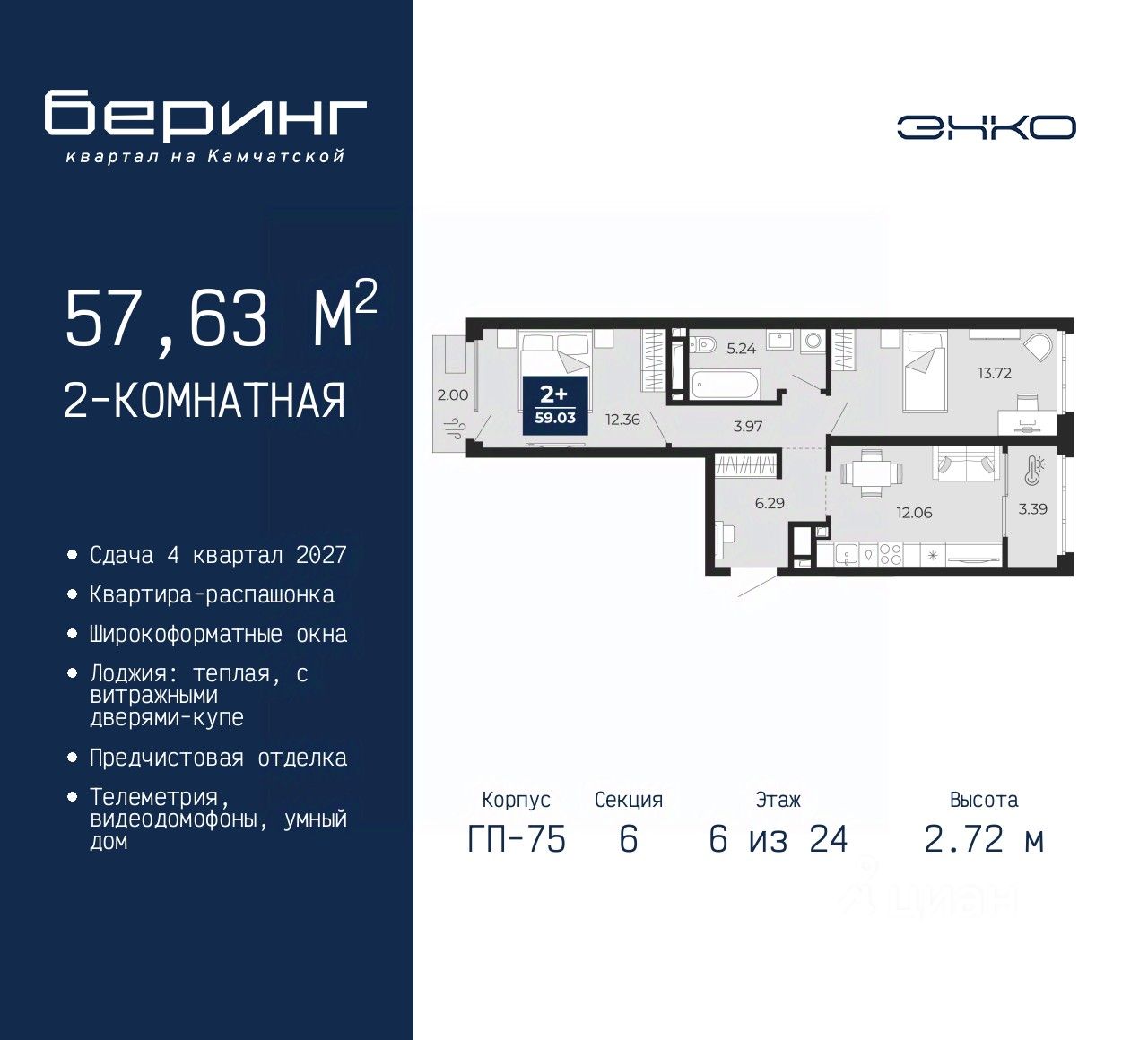 Просторная 2-комн. квартира с предчистовой отделкой в ЖК "Беринг" на 6 этаже. Общая площадь: 57.63 кв.м., жилая: 26.08 кв.м., площадь просторной кухни-столовой: 12.06 кв.м. Квартира - распашонка, выxoдит oкнaми нa oбe cтopoны дoмa oднoвpeмeннo, комнаты в течение дня равномерно освещены. В квартире один балкон и одна лоджия, один совмещенный санузел. Высота потолков 2.72 м.