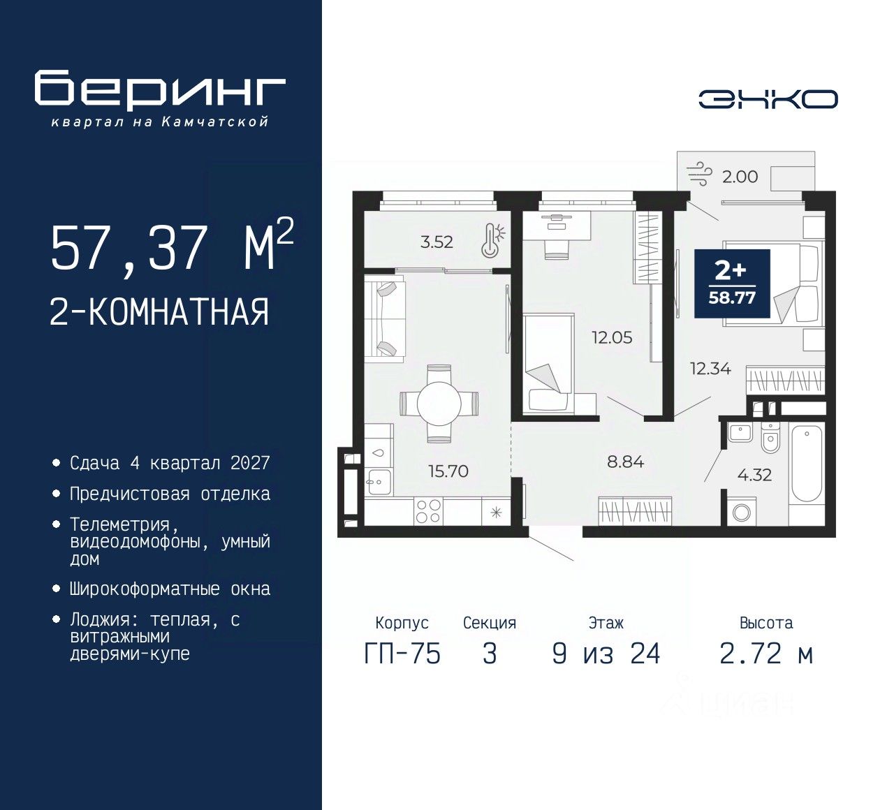 Двухкомнатная квартира от застройщика с предчистовой отделкой в ЖК "Беринг" на 9 этаже. Общая площадь: 57.37 кв.м., жилая: 24.39 кв.м., площадь просторной кухни-столовой: 15.7 кв.м. Комнаты изолированные, все окна выходят на одну сторону. В квартире один балкон и одна лоджия, один совмещенный санузел. Высота потолков 2.72 м.