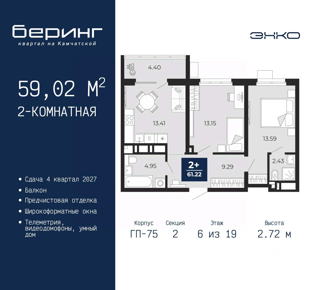 2-комн. квартира с предчистовой отделкой в ЖК "Беринг" на 6 этаже. Общая площадь: 59.02 кв.м., жилая: 26.74 кв.м., площадь просторной кухни-столовой: 13.41 кв.м. Комнаты изолированные, все окна выходят на одну сторону. В квартире один балкон, два совмещенных санузла. Высота потолков 2.72 м.
