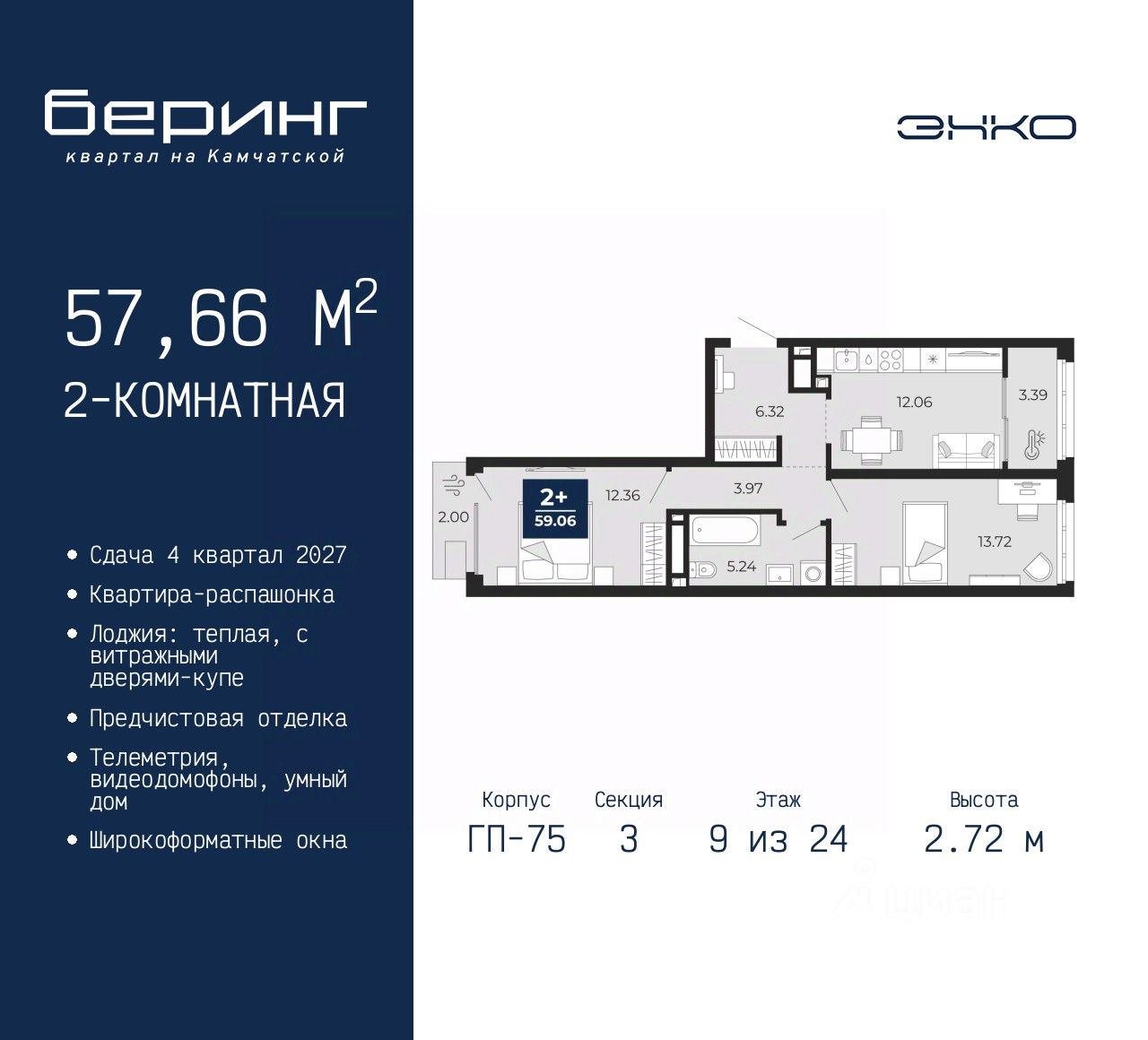 2-комн. квартира с предчистовой отделкой в ЖК "Беринг" на 9 этаже. Общая площадь: 57.66 кв.м., жилая: 26.08 кв.м., площадь просторной кухни-столовой: 12.06 кв.м. Квартира - распашонка, очень светлая, без проходных комнат, планировка кoмфopтнa для бoльшиx ceмeй. В квартире один балкон и одна лоджия, один совмещенный санузел. Высота потолков 2.72 м.