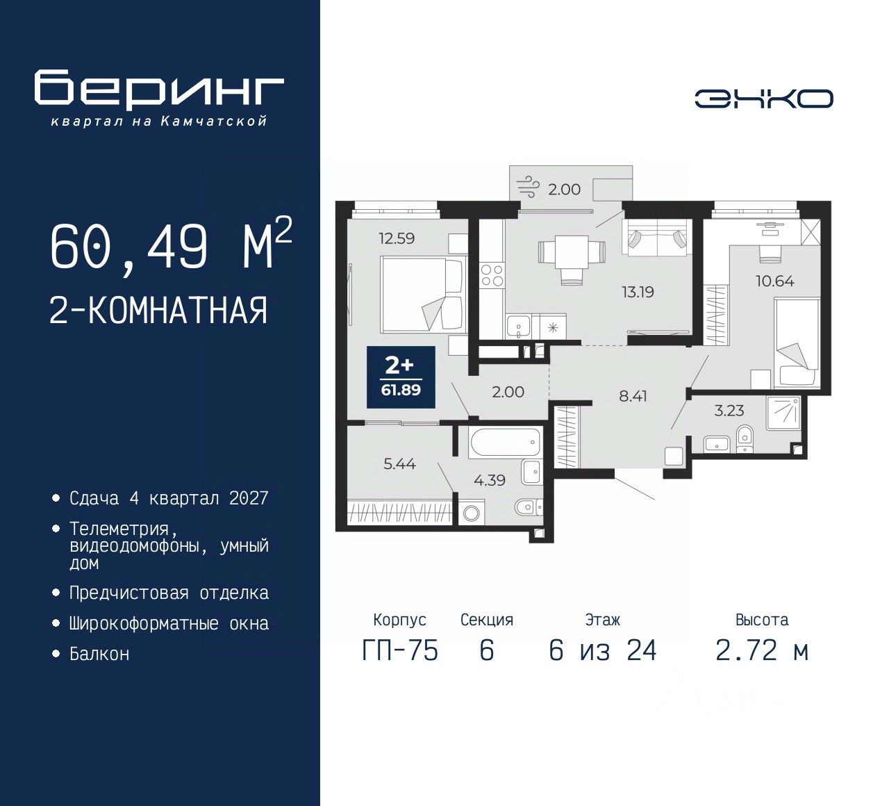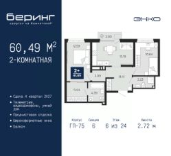 2-комн. квартира с предчистовой отделкой в ЖК "Беринг" на 6 этаже. Общая площадь: 60.49 кв.м., жилая: 23.23 кв.м., площадь просторной кухни-столовой: 13.19 кв.м. Комнаты изолированные, все окна выходят на одну сторону. В квартире один балкон, два совмещенных санузла. Высота потолков 2.72 м.