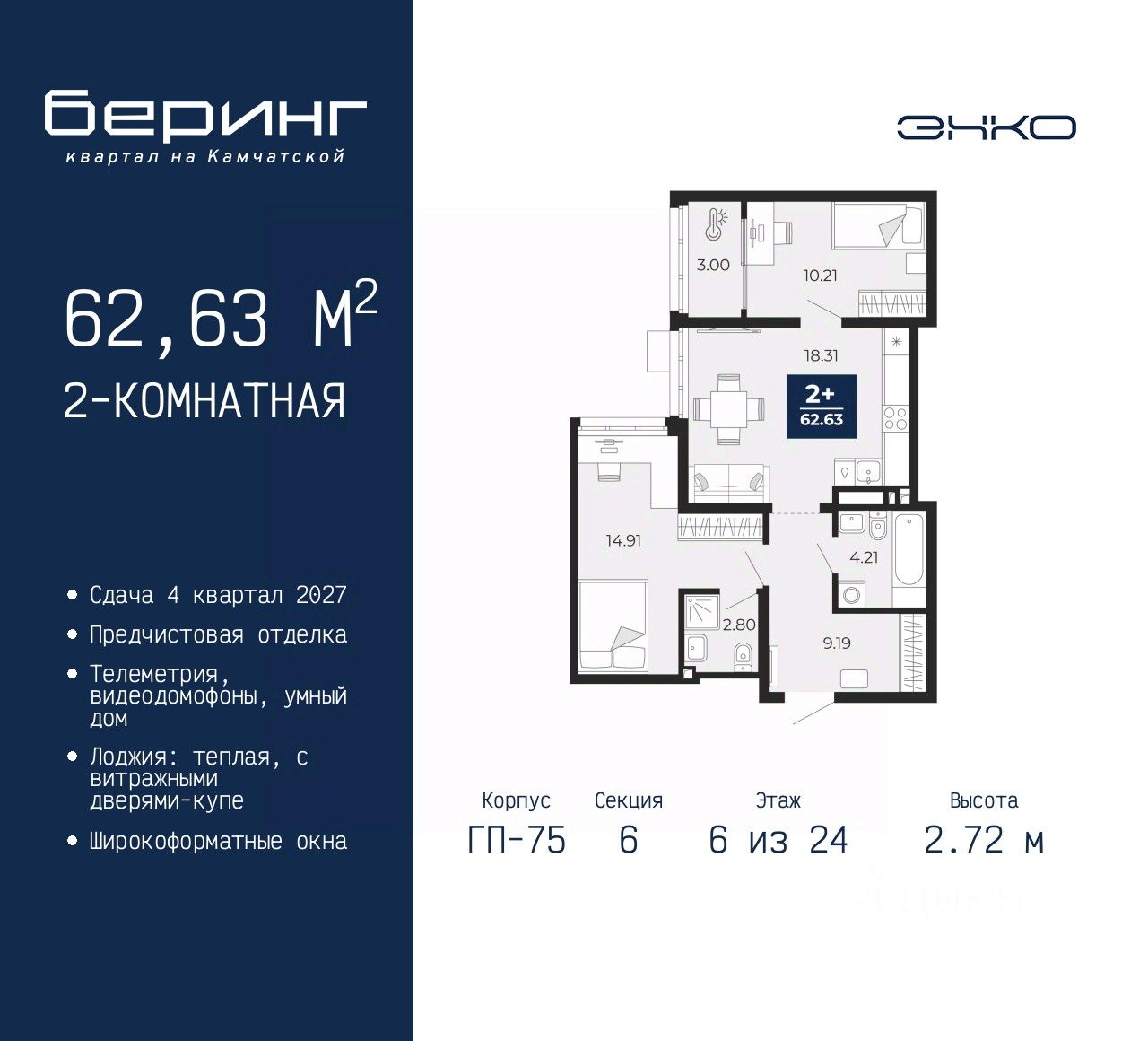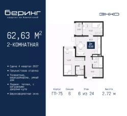 Двухкомнатная квартира с предчистовой отделкой в ЖК "Беринг" на 6 этаже. Общая площадь: 62.63 кв.м., жилая: 25.12 кв.м., площадь просторной кухни-столовой: 18.31 кв.м. Комнаты изолированные, все окна выходят на одну сторону. В квартире одна лоджия, два совмещенных санузла. Высота потолков 2.72 м.