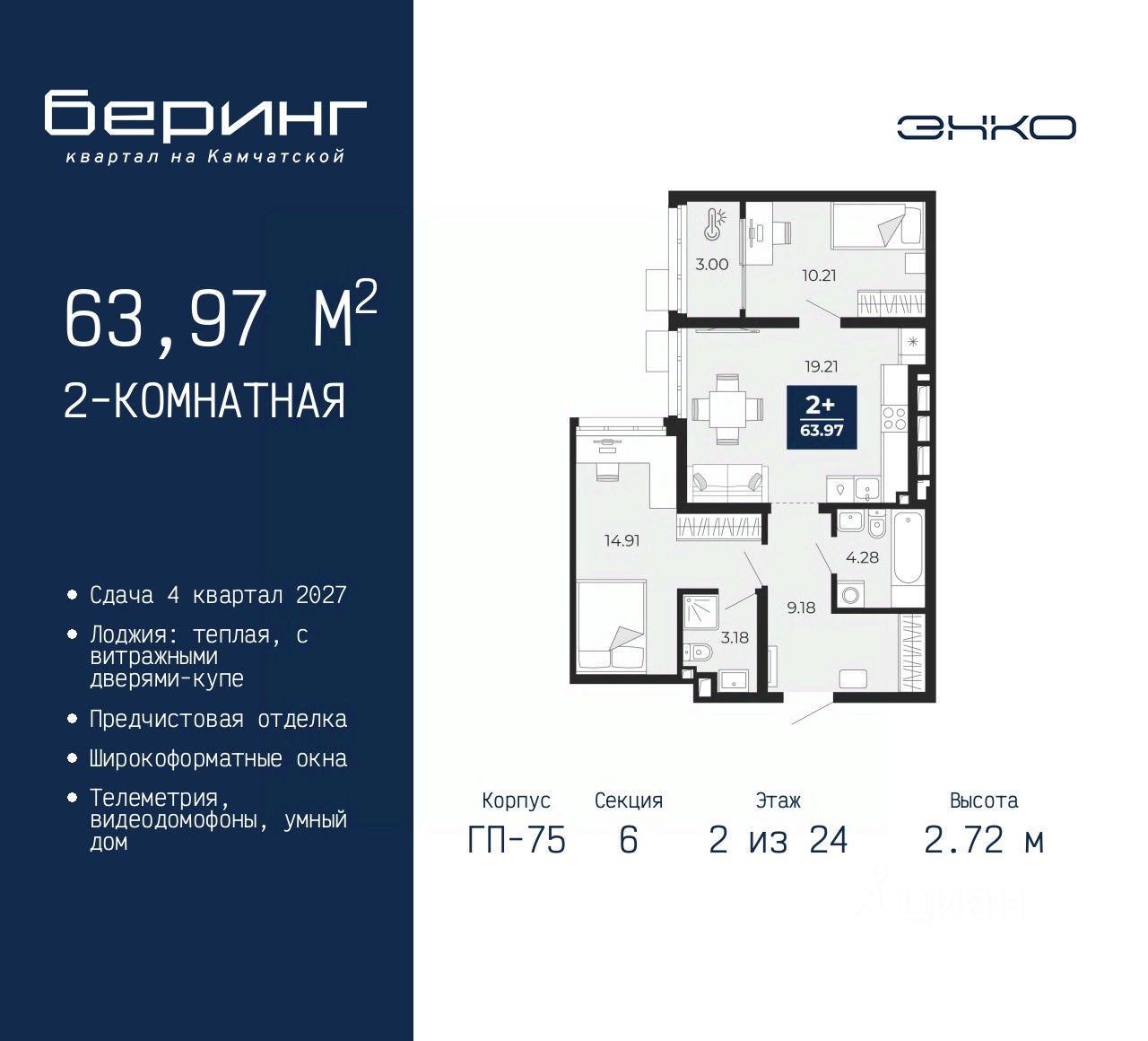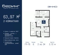 2-комн. квартира с предчистовой отделкой в ЖК "Беринг" на 2 этаже. Общая площадь: 63.97 кв.м., жилая: 25.12 кв.м., площадь просторной кухни-столовой: 19.21 кв.м. Комнаты изолированные, все окна выходят на одну сторону. В квартире одна лоджия, два совмещенных санузла. Высота потолков 2.72 м.
