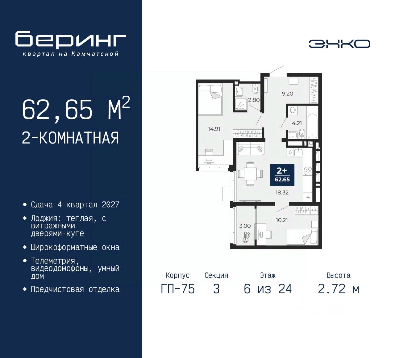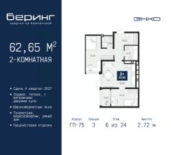 2-комн. квартира с предчистовой отделкой в ЖК "Беринг" на 6 этаже. Общая площадь: 62.65 кв.м., жилая: 25.12 кв.м., площадь просторной кухни-столовой: 18.32 кв.м. Комнаты изолированные, все окна выходят на одну сторону. В квартире одна лоджия, два совмещенных санузла. Высота потолков 2.72 м.