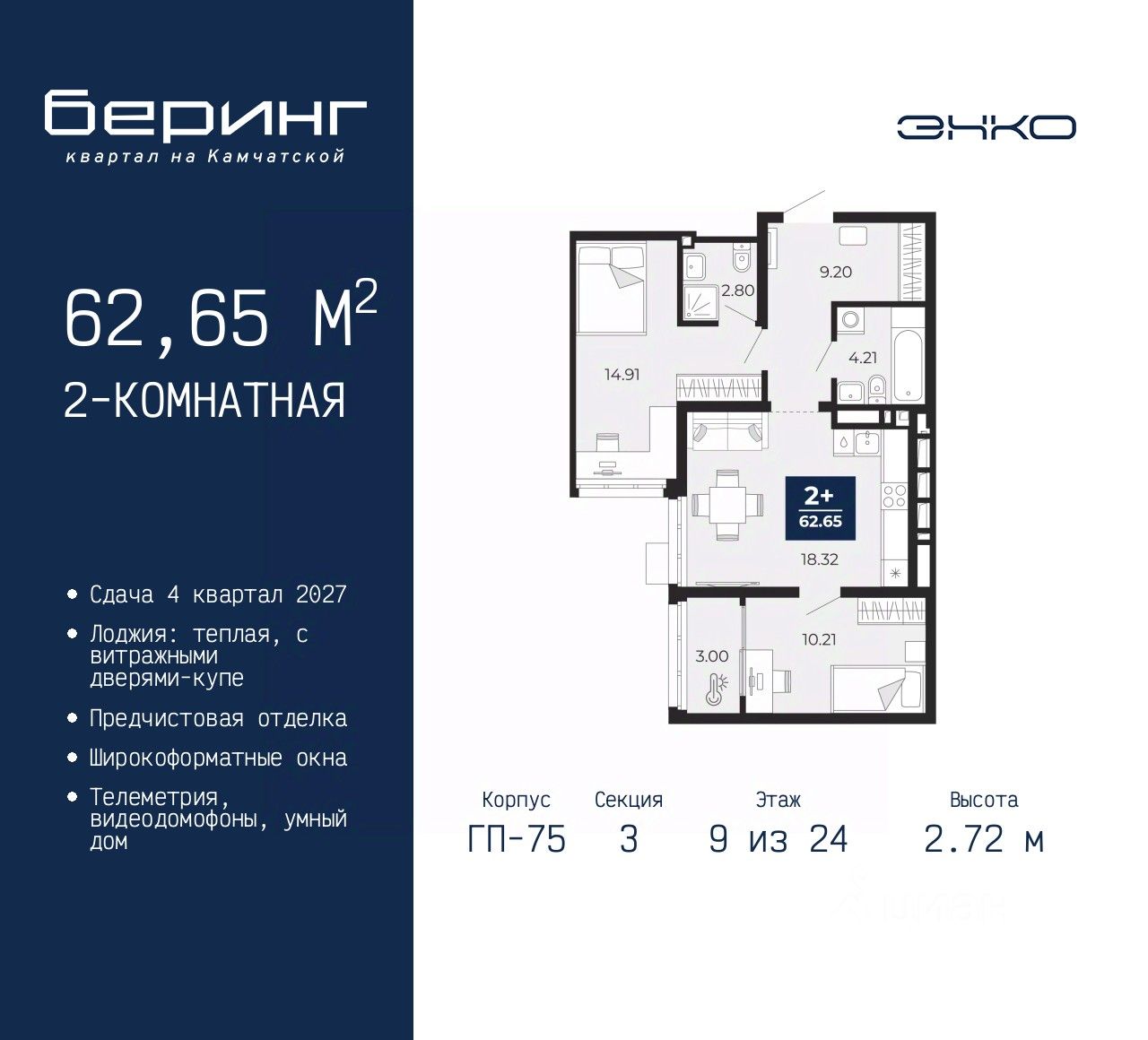 2-комн. квартира с предчистовой отделкой в ЖК "Беринг" на 9 этаже. Общая площадь: 62.65 кв.м., жилая: 25.12 кв.м., площадь просторной кухни-столовой: 18.32 кв.м. Комнаты изолированные, все окна выходят на одну сторону. В квартире одна лоджия, два совмещенных санузла. Высота потолков 2.72 м.