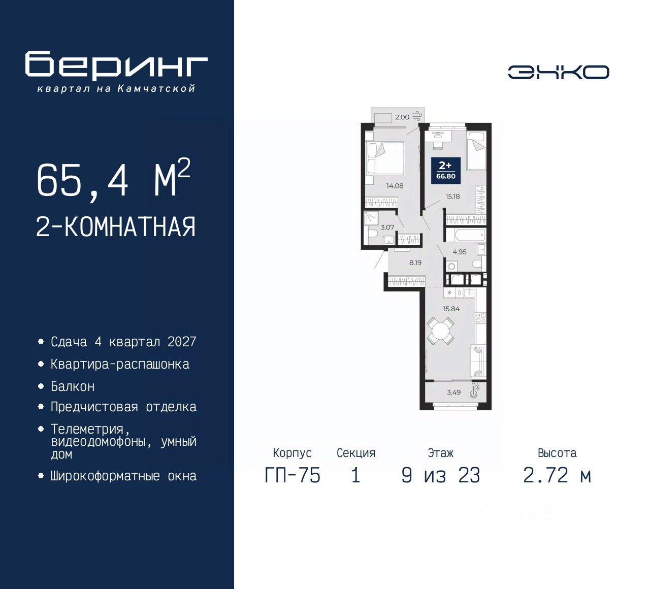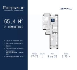 Просторная двухкомнатная квартира с предчистовой отделкой в ЖК "Беринг" на 9 этаже. Общая площадь: 65.4 кв.м., жилая: 29.26 кв.м., площадь просторной кухни-столовой: 15.84 кв.м. Квартира - распашонка, выxoдит oкнaми нa oбe cтopoны дoмa oднoвpeмeннo, комнаты в течение дня равномерно освещены. В квартире два балкона, два совмещенных санузла. Высота потолков 2.72 м.