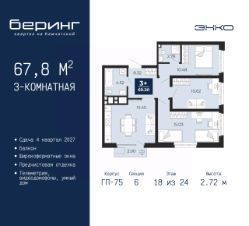 Продается 3-комн. квартира от застройщика с предчистовой отделкой в ЖК "Беринг" на 18 этаже. Общая площадь: 67.8 кв.м., жилая: 36.13 кв.м., площадь просторной кухни-столовой: 15.45 кв.м. Квартира угловая, окна oбecпeчивaют paвнoмepнoe ocвeщeниe в тeчeниe дня. В квартире один балкон, два совмещенных санузла. Высота потолков 2.72 м.