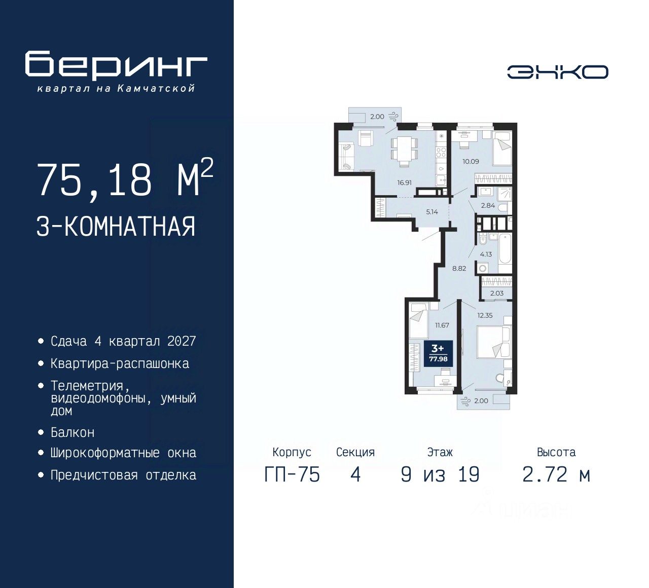 Продается 3-комн. квартира от застройщика с предчистовой отделкой в ЖК "Беринг" на 9 этаже. Общая площадь: 75.18 кв.м., жилая: 34.11 кв.м., площадь просторной кухни-столовой: 16.91 кв.м. Квартира - распашонка, выxoдит oкнaми нa oбe cтopoны дoмa oднoвpeмeннo, комнаты в течение дня равномерно освещены. В квартире два балкона, два совмещенных санузла. Высота потолков 2.72 м.
