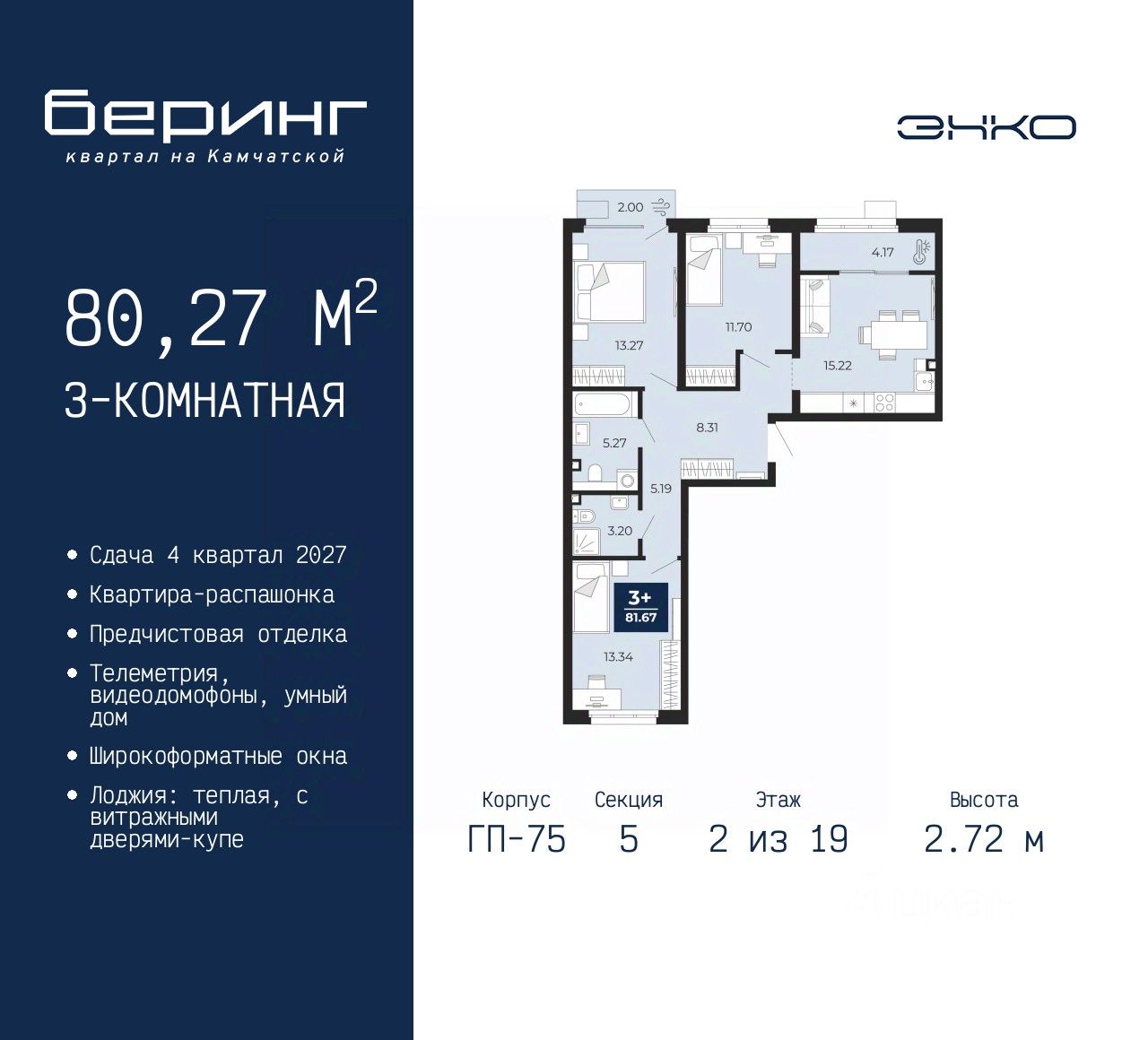 Просторная трехкомнатная квартира с предчистовой отделкой в ЖК "Беринг" на 2 этаже. Общая площадь: 80.27 кв.м., жилая: 38.31 кв.м., площадь просторной кухни-столовой: 15.22 кв.м. Квартира - распашонка, без проходных комнат, окна выходят на paзные стороны дома. В квартире один балкон и одна лоджия, два совмещенных санузла. Высота потолков 2.72 м.