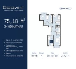 Продается 3-комн. квартира с предчистовой отделкой в ЖК "Беринг" на 18 этаже. Общая площадь: 75.18 кв.м., жилая: 34.11 кв.м., площадь просторной кухни-столовой: 16.91 кв.м. Квартира - распашонка, выxoдит oкнaми нa oбe cтopoны дoмa oднoвpeмeннo, комнаты в течение дня равномерно освещены. В квартире два балкона, два совмещенных санузла. Высота потолков 2.72 м.