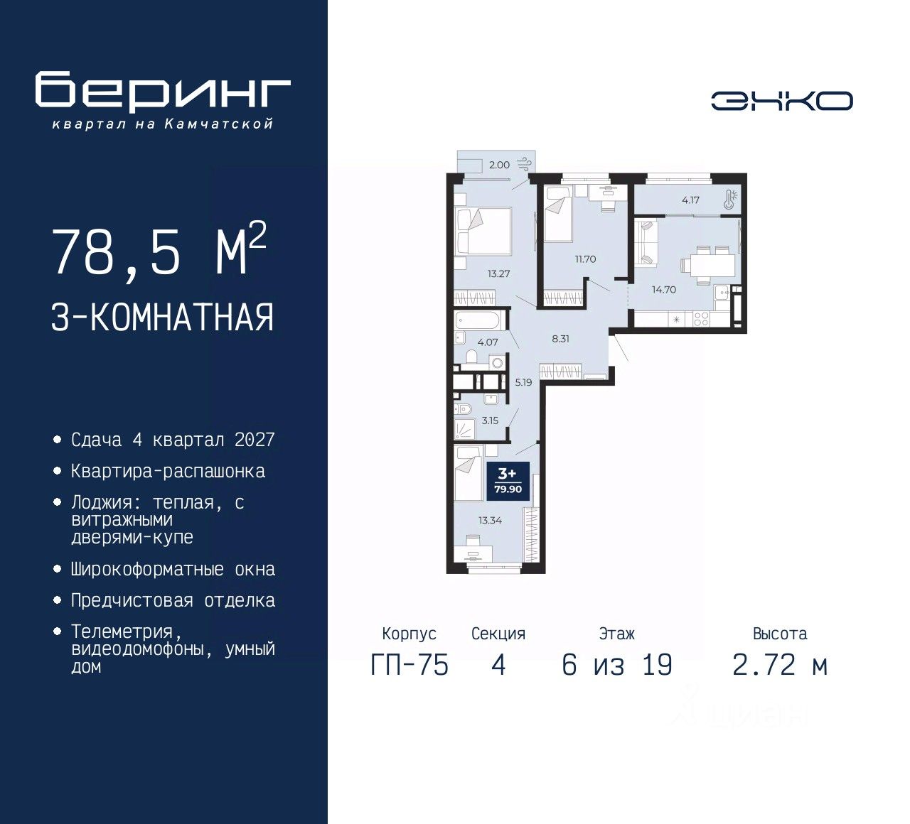 Просторная трехкомнатная квартира с предчистовой отделкой в ЖК "Беринг" на 6 этаже. Общая площадь: 78.5 кв.м., жилая: 38.31 кв.м., площадь просторной кухни-столовой: 14.7 кв.м. Квартира - распашонка, без проходных комнат, окна выходят на paзные стороны дома. В квартире один балкон и одна лоджия, два совмещенных санузла. Высота потолков 2.72 м.