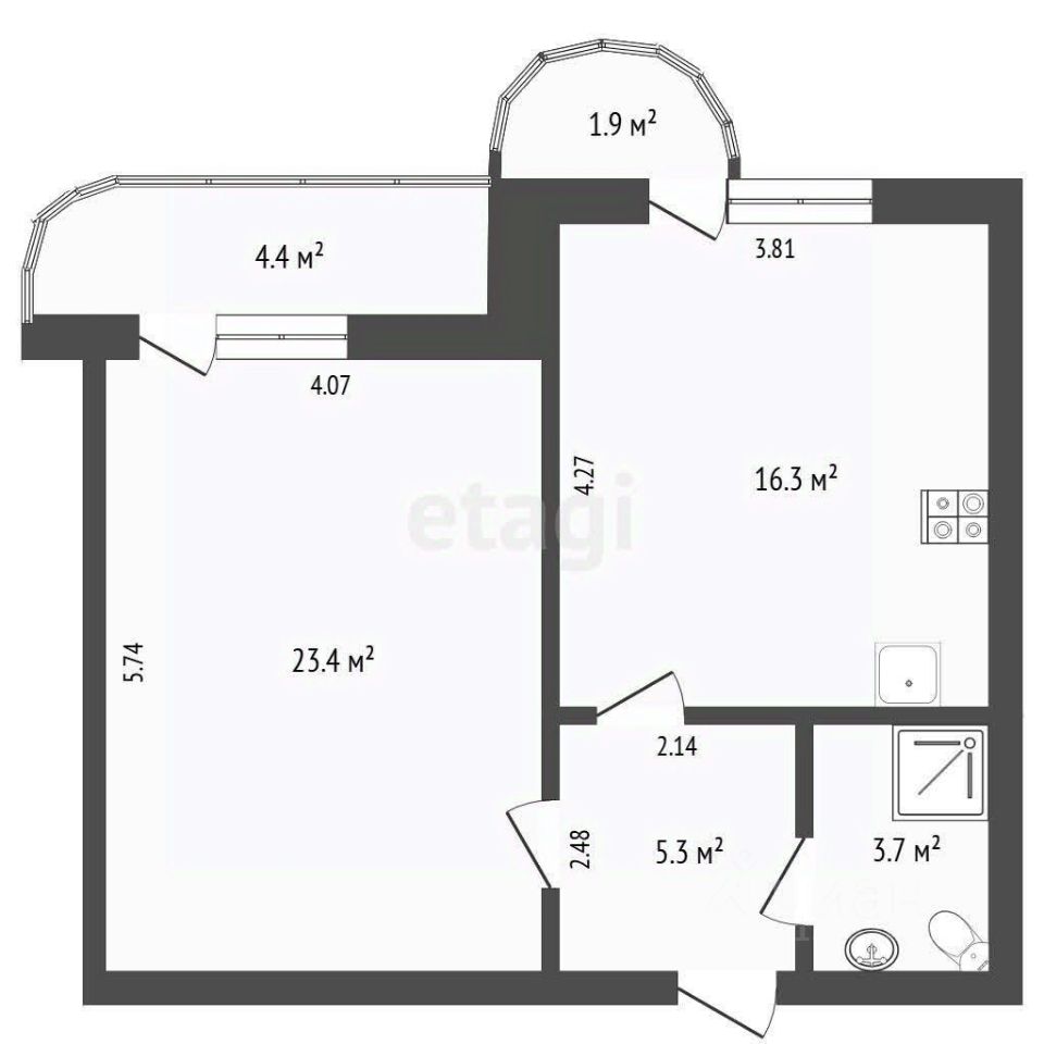 Квартира в самом сердце Тюмени, в центре города площадью 48,7 м2.