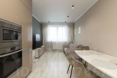 Теплая, уютная и светлая квартира подойдет для комфортного проживания семьи. Представляет собой евротрешку с двумя отдельными спальнями - для родителей и детская комната. В гостиной отлично сочетаются кухонная и столовая зона, а также зона для отдыха. Гармонично подобрана мебель и предметы интерьера. Большой балкон с панорамным остеклением в теплое время года является отдельной комнатой для приятного провождения времени, откуда открывается великолепный вид на экопарк Затюменский и коттеджную застройку. В холодное время года в квартире очень тепло. "Плавающая" стяжка пола дает высокую звукоизоляцию. Интерьер компактной квартиры выполнен с учетом рационального использования пространства, что в современных условиях является большим достоинством.