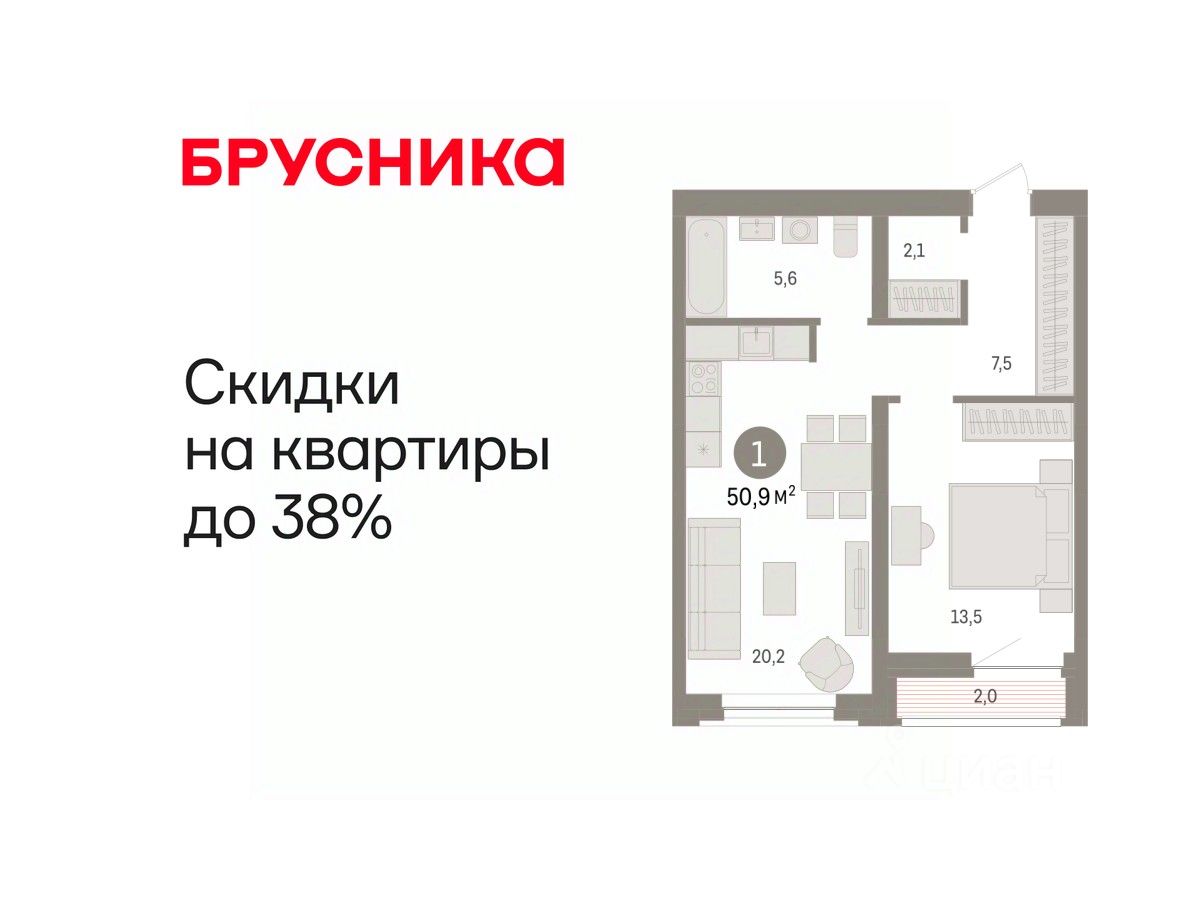 Квартира с кухней-гостиной и одной спальней в жилом районе "Речной порт". Особенности планировки: предчистовая отделка.