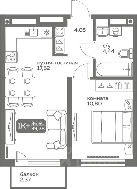 Прямая продажа от застройщика! Продается однокомнатная квартира в строящемся ЖК "Меридиан Слобода", срок сдачи: I-кв. 2027, общей площадью 36.91 м², на 9 этаже из 20. Площадь кухни — 17.62 м².
