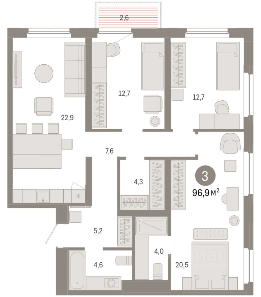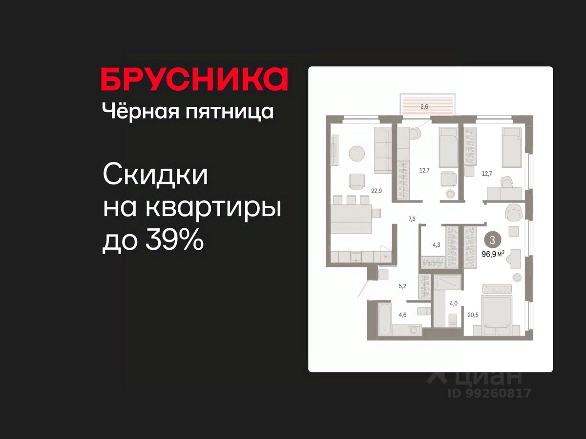 Квартира с кухней-гостиной и тремя спальнями в жилом районе "Зарека". Особенности планировки: гардеробная, предчистовая отделка, мастер-спальня, балкон.