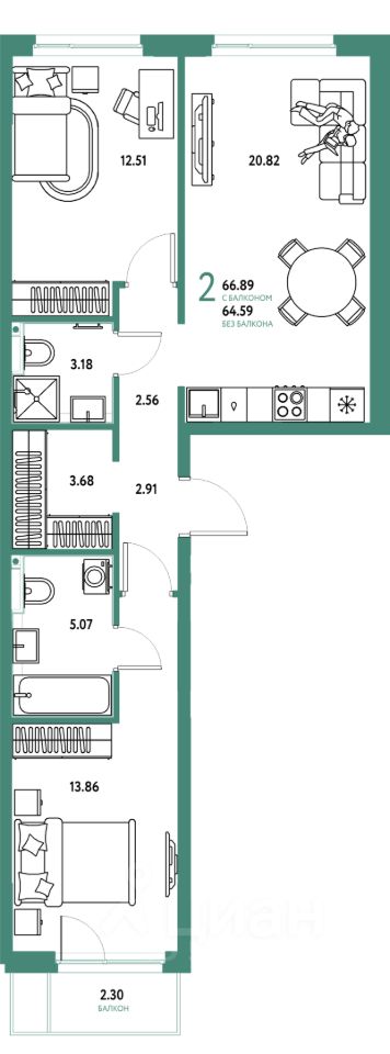 Продаётся 2-комнатная квартира в строящемся доме (Квартал Инженеров (ГП-7)), срок сдачи: IV-кв. 2027, общей площадью 66.89 кв.м., на 12 этаже. Новый жилой комплекс "Сердце Сибири" расположился в центре Тюмени в границах улиц 50 лет Октября-Пермякова-Харьковская.