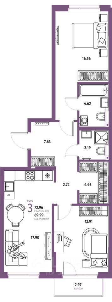 Продаётся 3-комнатная квартира в строящемся доме (Квартал Инженеров (ГП-7)), срок сдачи: IV-кв. 2027, общей площадью 72.96 кв.м., на 9 этаже. Новый жилой комплекс "Сердце Сибири" расположился в центре Тюмени в границах улиц 50 лет Октября-Пермякова-Харьковская.