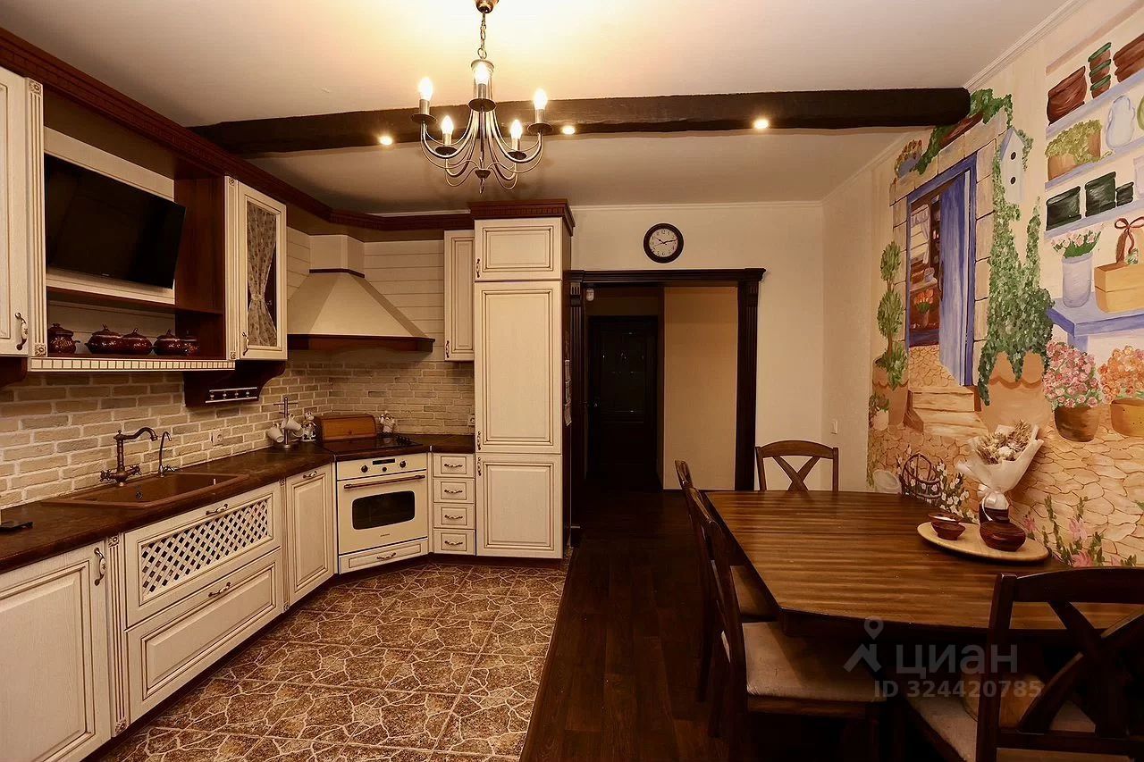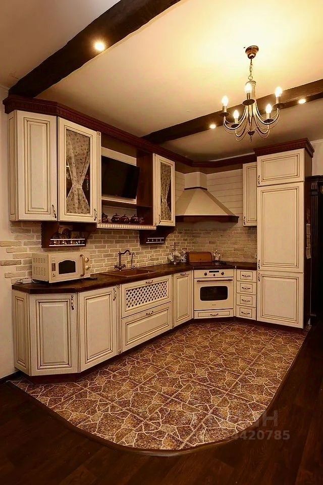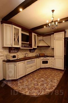 Кухня выполнена в стиле кантри по индивидуальному заказу. По всей квартире пластиковые окна, подоконники и откосы дополнительно утеплены. Межкомнатные двери выполнены из деревянного шпона с матовым стеклом. Входная дверь усиленная, с дополнительной шумоизоляцией.