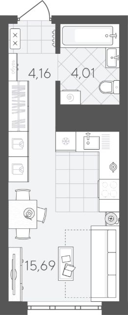 Основная комната в квартире многофункциональна и легко трансформируется в гостиную, спальню или столовую.