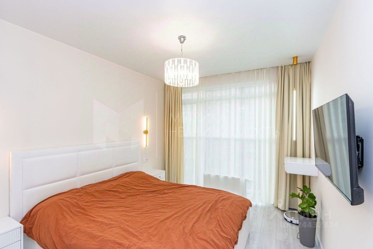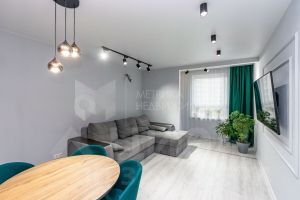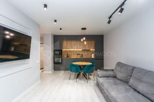 Кухня оборудована современным гарнитуром с встроенной техникой: варочной панелью, духовым шкафом, вытяжкой, холодильником и микроволновой печью, а также посудомоечной машиной. Обеденная зона и удобный диван делают пространство функциональным. Одна из спален имеет выход на французский балкон, добавляя естественного света и возможности для небольшой зоны отдыха. Санузел совмещенный, с акриловой ванной, навесной тумбой с подсветкой и инсталляцией. В квартире выполнен качественный ремонт с использованием долговечных материалов в актуальной цветовой гамме.