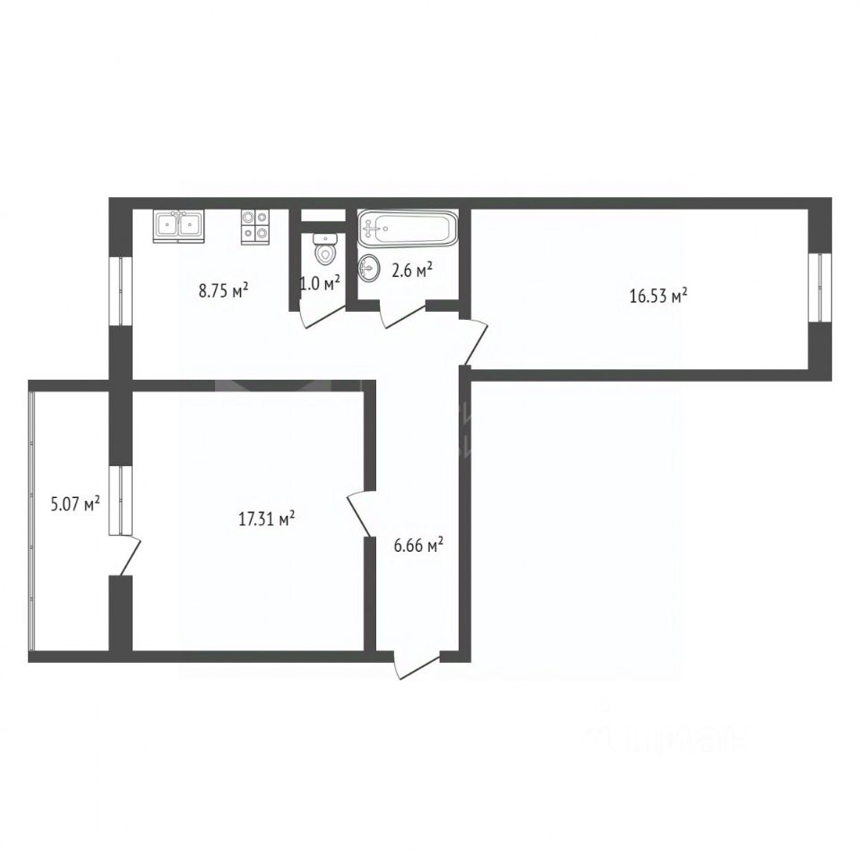 • Окна выходят на две стороны, обеспечивая солнечное освещение.